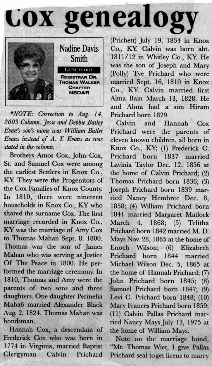 Brothers Amos Cox, John Cox, Sr., and Samuel Cox were among the earliest Settlers in Knox County, Kentucky.