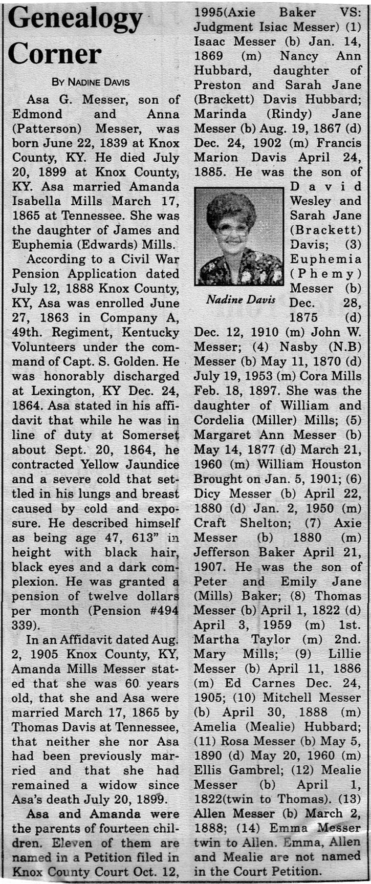 Asa G. Messer b. June 22, 1839 d. July 20, 1899 m. Amanda Isabella Mills