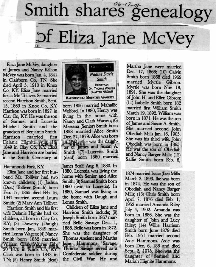 Eliza Jane McVey b. Jan. 4, 1881 d. Apr. 5, 1910 m 1st Mr. Tolliver, 2nd Harrison Smith.