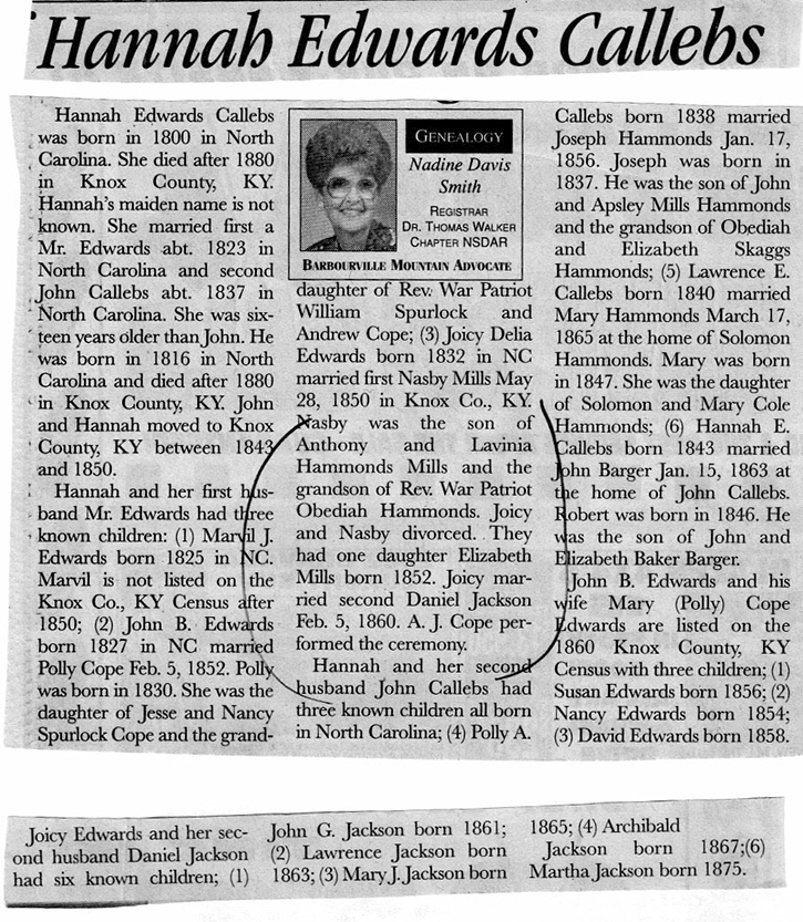 Hannah Edwards Callebs b. 1800 d. after 1880 m. 1st Mr. Edwards, 2nd John Callebs