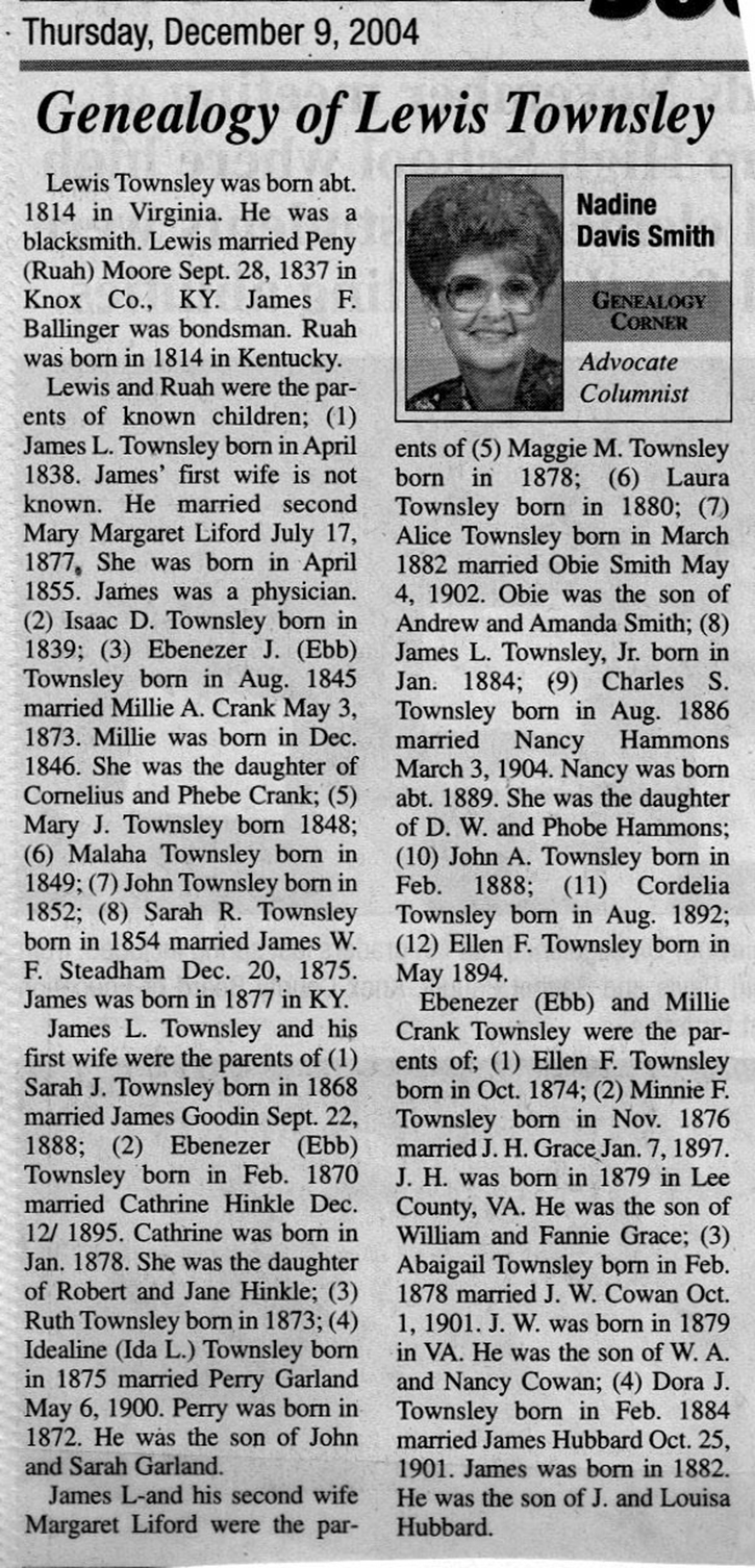 Lewis Townsley b. abt. 1814 m. Peny Ruah Moore