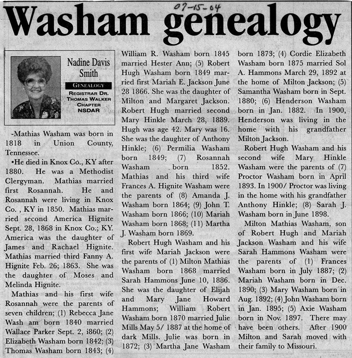 Mathias Washam b. 1818 d. after 1880 m. 1st Rosannah ?, 2nd America Hignite, 3rd Fanny A. Hignite