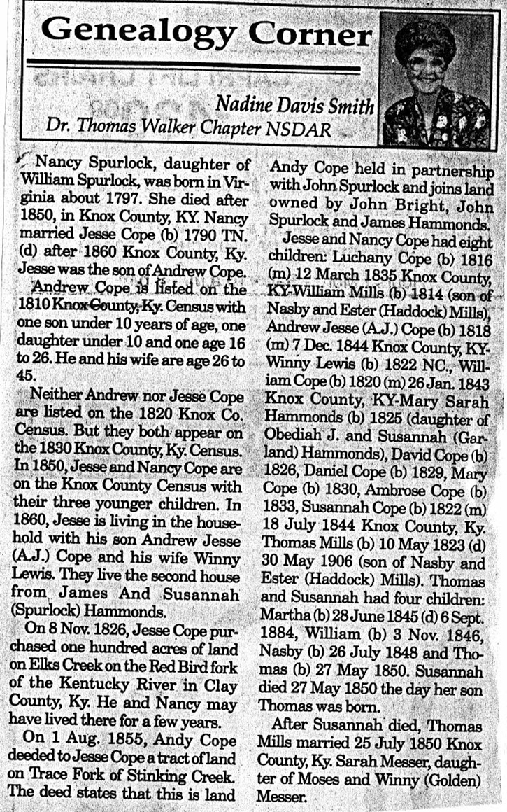 Nancy Spurlock b. abt. 1797 d. after 1850 m. Jesse Cope