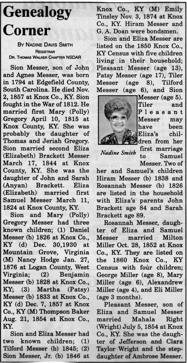 Sion Messer b. abt 1794 d. Nov. 2, 1857 m. 1st Mary Polly Gregory, 2nd Elizabeth Brackett. Sion fought in the War of 1812