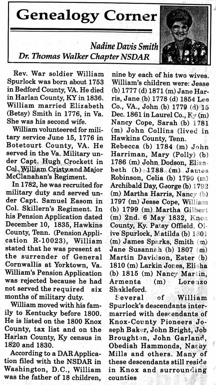 Revolutionary War Soldier William Spurlock b. abt. 1753 d. 1836 m. Elizabeth ( Betsy ) Smith