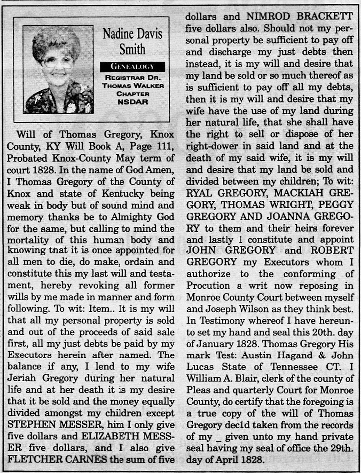 Thomas Gregory will Probated May 1828