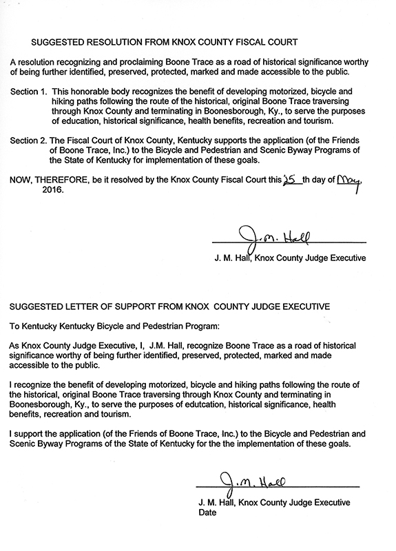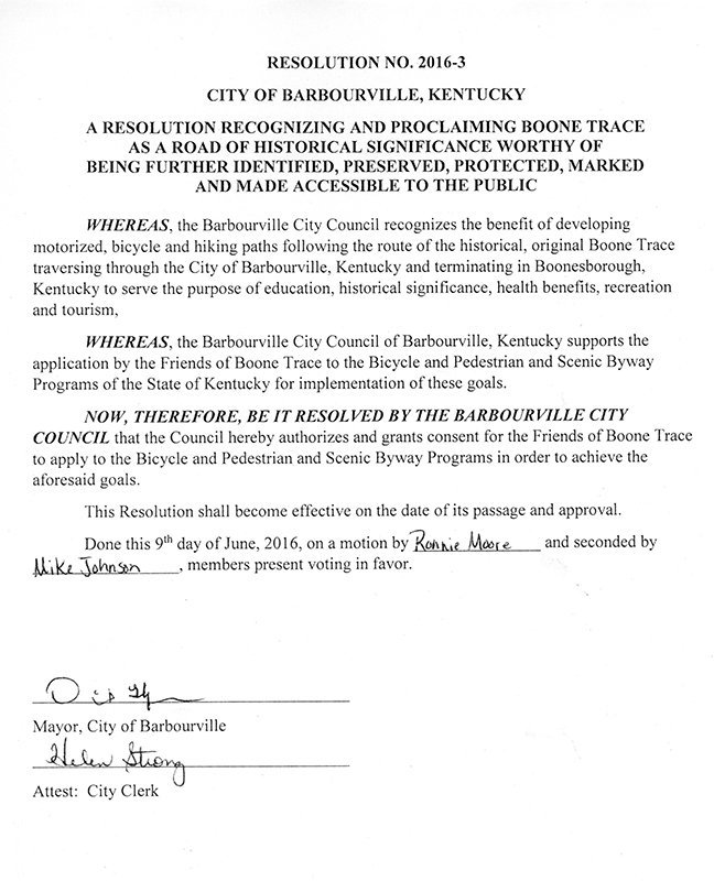 The City of Barbourville and Knox County Fiscal Court have passed resolutions in support of the historical significance of the old Boone Trace which passes through Knox County, Kentucky.