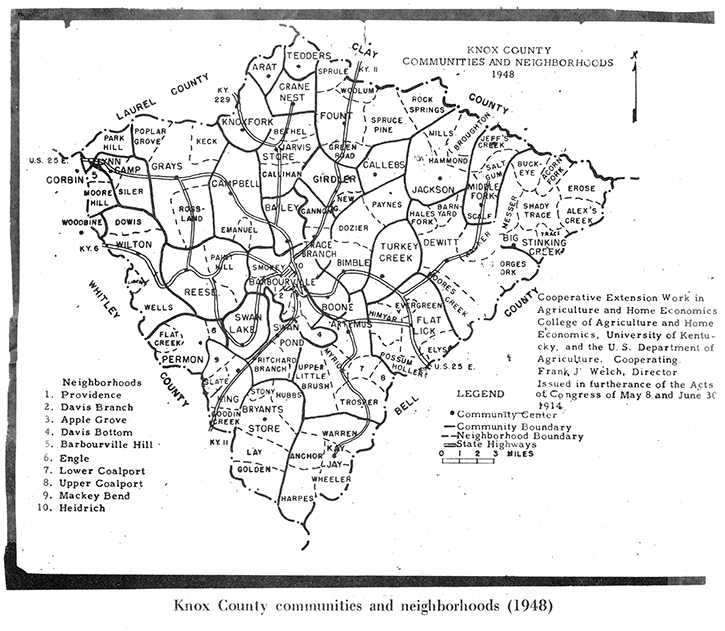 This 1948 map of Knox County, Kentucky's communities and neighborhoods was published in the Barbourville Mountain Advocate newspaper on July 1, 1976.
